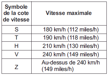 Le tableau ci-dessous répertorie les différentes cotes de vitesse utilisées par les véhicules de tourisme. La cote de vitesse est indiquée dans la désignation de dimension du pneu figurant sur le flanc du pneu. Ce symbole correspond à la vitesse de conception maximale de ce pneu.
