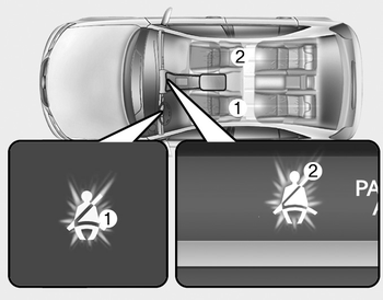 Si la ceinture du conducteur ou du passager avant est détachée lorsque le contact est mis ou si la ceinture est détachée après avoir mis le contact, le témoin de la ceinture de sécurité correspondant reste allumé jusqu'à ce que la ceinture soit attachée.