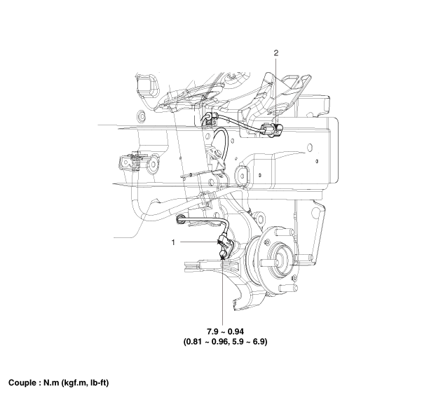 1. Capteur de vitesse de roue avant 2. Connecteur du capteur de vitesse de roue avant |