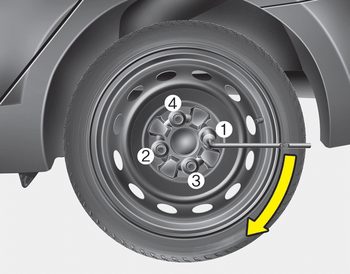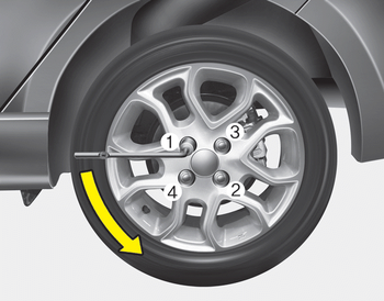 Puis positionnez la clé comme l’indique le schéma et serrez les écrous de roue. Assurez-vous que la douille repose complètement sur l’écrou. Ne vous tenez pas debout sur la clé à pipe ou n’utilisez pas de raccord sur la clé à pipe. Faites le tour de la roué en serrant chaque autre écrou jusqu’à ce qu’ils soient tous serrés. Puis vérifiez à nouveau que chaque écrou est bien serré. Après remplacement des roues, faites serrer les écrous de roue au bon couple dès que possible par un concessionnaire Kia agréé.