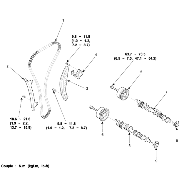 4. Tendeur de la chaîne de distribution 5. CVVT d'échappement 6. CVVT d'admission |