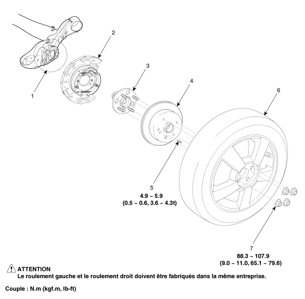 5. Vis de fixation du disque de frein arrière 6. Roue/pneu arrière 7. Écrou de roue arrière |