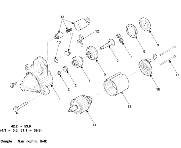 10. Plaque du levier  11. Garniture du levier 12. Levier 13. Interrupteur magnétique 14. Armature 15. Fourchette 16. Ensemble du porte-balais 17. Boulon passant  |