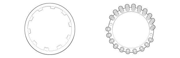 La retenue de chaque embrayage est constituée de pièces de tôle de précision pour améliorer la productivité et la légèreté. Le dispositif d'équilibrage de pression d'huile hydraulique centrifuge se trouve dans l'ensemble d'embrayage. En général, l'huile restant dans la chambre de pression d'huile du piston pousse le piston par la force centrifuge. Mais, pour éviter que le piston soit poussé, l'huile contenue entre le piston et la retenue du ressort de retour subit la force centrifuge et les deux forces s'annulent, si bien que le ressort ne bouge pas. Cela contribue à améliorer la durabilité et la commande changement de vitesse. |