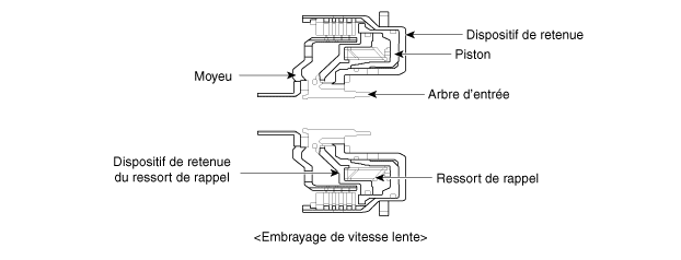 lente. La pression d'huile dans les composants d'embrayage de vitesse lente fonctionne entre le piston et la retenue et pousse le piston vers les disques d'embrayage pour fournir la puissance d'entraînement depuis la retenue au moyeu. |