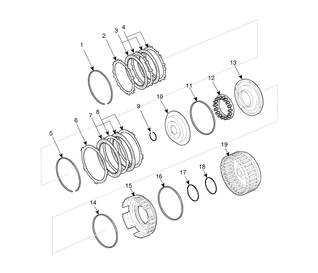 11. Joints D 12. Ressort de rappel 13. Piston d'embrayage de surmenage 14. Joints D 15. Piston d'embrayage arrière 16. Joints D 17. Joints D 18. Joints D 19. Retenue d′embrayage arrière |