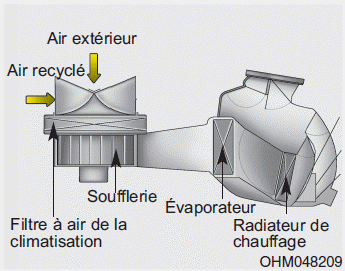 Le filtre à air de la climatisation installé derrière la boîte à gants filtre la poussière et les autres polluants qui proviennent de l’extérieur et pénètrent dans le véhicule via le système de chauffage et de climatisation. Au bout d’un certain temps, l’accumulation de poussière ou d’autres polluants dans le filtre peut réduire le flux d’air provenant des ventilateurs. Aussi, l’humidité se forme plus facilement à l’intérieur du pare-brise, même lorsque la position d’air extérieur (frais) est sélectionnée. Si cela se produit, demandez à un concessionnaire Kia agréé de changer le filtre à air du système de climatisation.