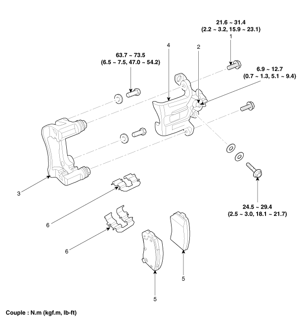 4. Corps de l'étrier 5 : Plaquette de frein 6. Système de rétention du patin |