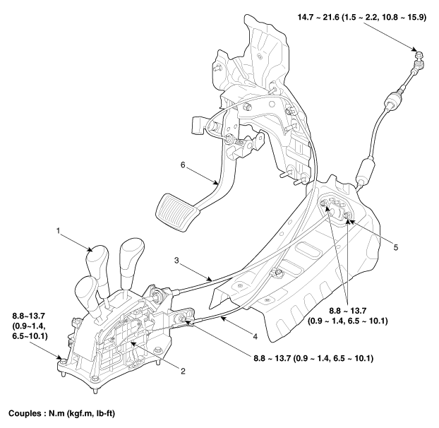 4. Ensemble du câble de blocage de changement de vitesse 5. Retenue 6. Ensemble de pédale de frein |