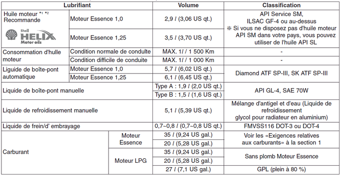 N’utilisez que des lubrifiants de qualité appropriée pour obtenir de bonnes performances et une longévité satisfaisante du moteur et de la transmission. Un lubrifiant approprié augmenter les performances du moteur et vous permet de réaliser des économies de carburant. L’utilisation de ces lubrifiants et liquides est recommandée pour votre véhicule.