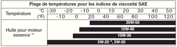 Des huiles moteur de viscosité moins élevée permettent d’obtenir de meilleures économies de carburant et de meilleures performances par temps froid ; cependant, une bonne lubrification par temps chaud exige des huiles moteur de viscosité plus élevée.