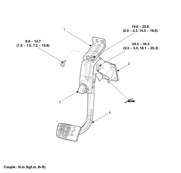 3. Interrupteur de feu stop 4. Bras de la pédale de frein |