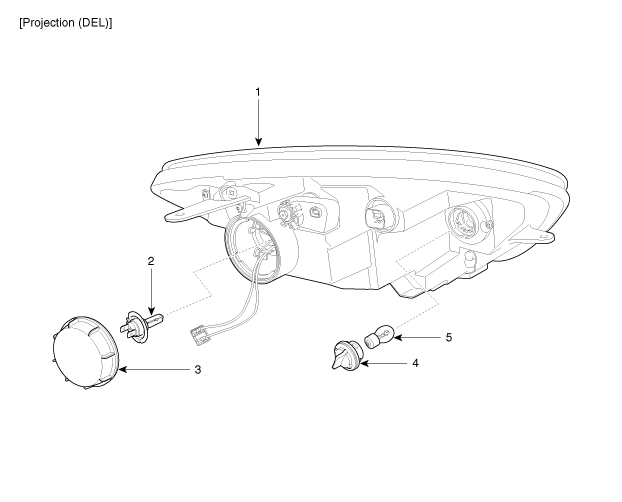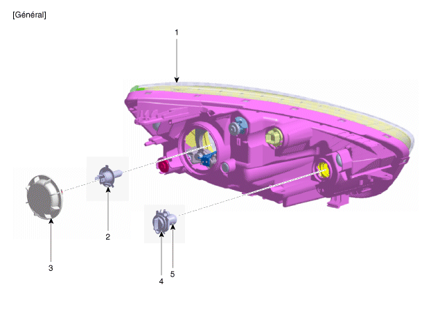1. Lentilles de phare et bloc de logement  2. Voyant de phare (bas/haut) 3. Chapeau pare-poussière  |
