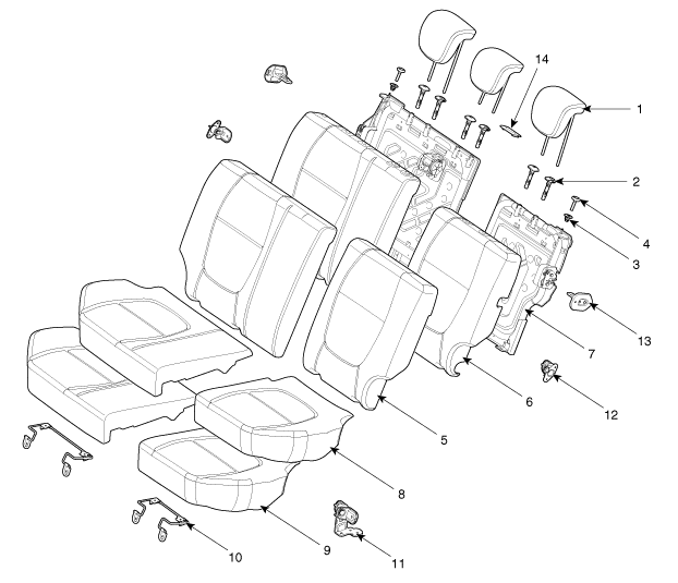 8. Revêtement du coussin de siège arrière 9. Ensemble du cadre et du rembourrage du coussin de siège arrière 10. Ensemble du cadre de liaison du coussin de siège arrière 11. Ensemble du support de montage central arrière 12. Ensemble du support de montage latéral arrière 13. Ensemble du support de gâche arrière 14. Couvercle de la sangle du dossier arrière |