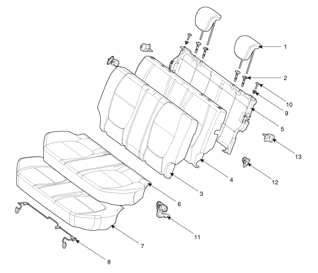 8. Ensemble du cadre de liaison du coussin de siège arrière 9. Ensemble de la collerette de dossier arrière 10. Bouton d'escamotage de dossier arrière 11. Ensemble du support de montage central arrière 12. Ensemble du support de montage latéral arrière 13. Ensemble du support de gâche arrière |